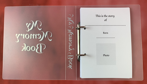 The book is supplied in either an A5 A durable polypropylene binder featuring the words "My Memory Book" in gold foil on the front cover.
