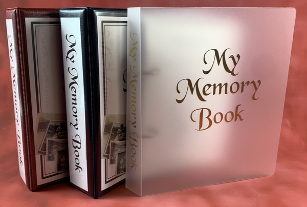 The book is supplied in either an A5 A durable polypropylene binder featuring the words "My Memory Book" in gold foil on the front cover.
